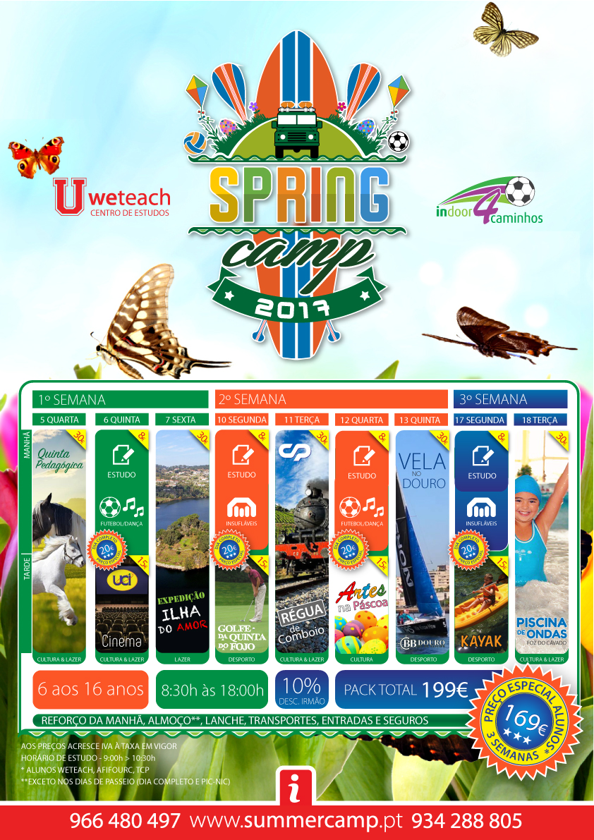No Spring Camp 2017 está incluído o reforço da manhã (sumo e peça de fruta), almoço, e lanche (sumo e pão c/ manteiga/fiambre ou queijo). Nos dias das visitas exteriores de dia completo 5, 7, 11, 13, 18 os pais deverão fornecer o almoço.